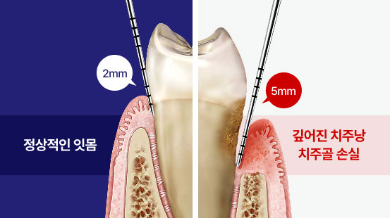 염증으로 인해 부은 잇몸은 치주낭(세균집)을 형성해요.